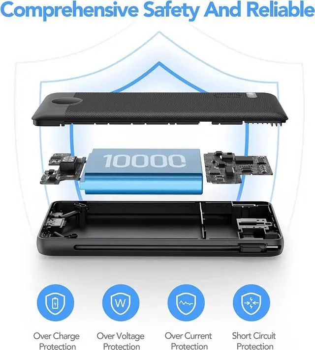 Safety ChargingThe 10000mah power bank built in wall plug uses high-quality smart chip, which will protect your device from overcharge, overcurrent, overvoltage, and short-circuit, creating a safe charging experience for you. *