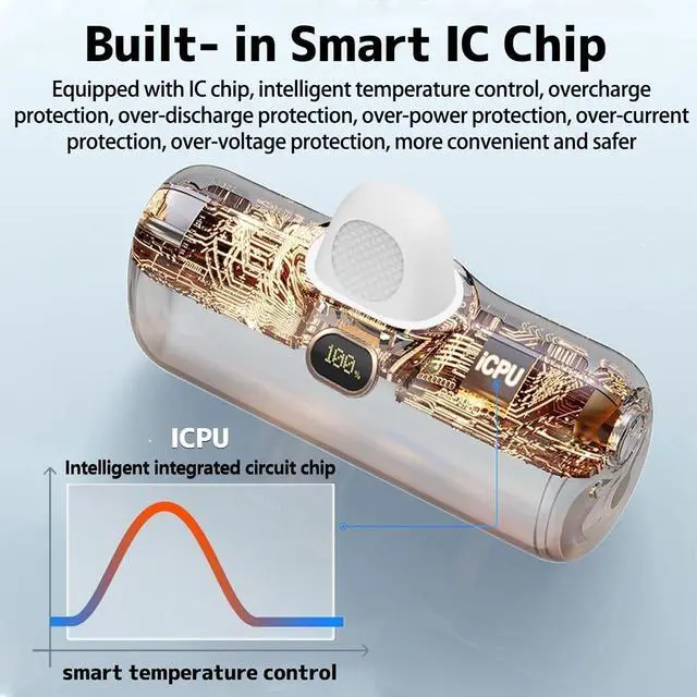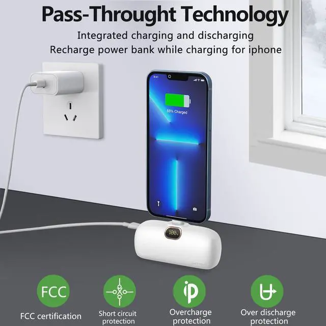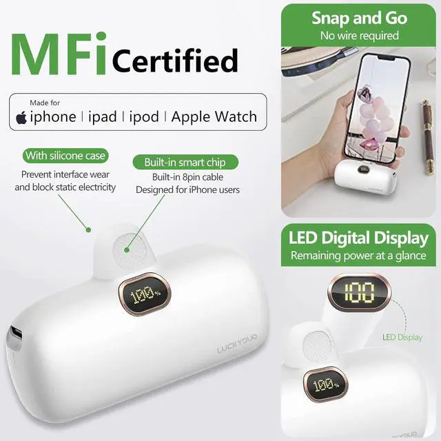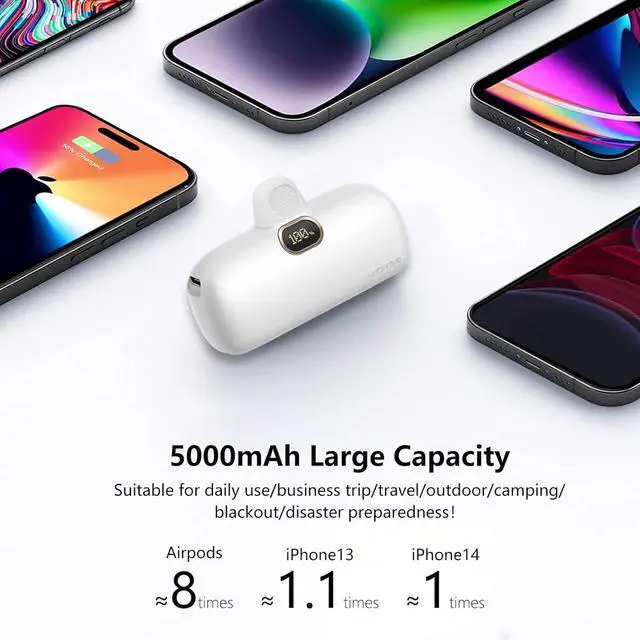 Mini Size&Compatibility92g lightweight for iphone portable charger. Size of a lipstick allows you to take it in your pocket, bag or handbag easily, saving your bag spacing. This powerbank fast charging built with 8pin output connector compatible with iPhone 14 / 13 / 12 / 11 / XR / XS / X / 8 / 7 / 6 Mini Pro Max Plus, Airpods.