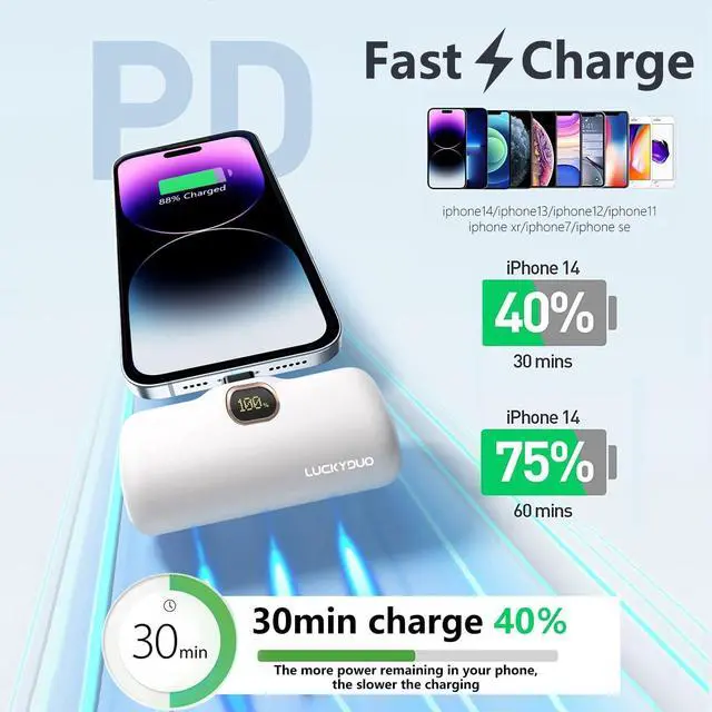 Charge On the Go&Fast ChargingSmall power bank for iphone, its USB C input supports fast charging. Fully recharged only taking 1.5 hours by 9V-2A Quick recharging. Battery pack power bank output supports 20W PD, thus it can quick charge for iphone series, will charge other phone at 5V normal charging speed. Small body big power, enough for emergency use when going out. Suitable for daily use/business trip/travel/outdoor/camping/blackout/disaster preparedness