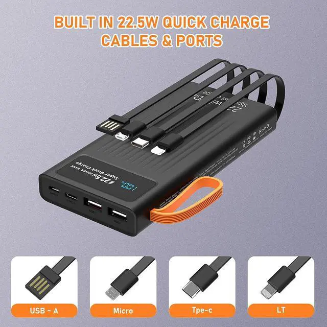 Universal compatible with All popular smart devicesAs portable phone charger power bank builts in USB A, USB C, Micro USB port and multi cables, it is widely compatible with all brands cellphones or tablets. Widely compatible with iPhone 14 13 12 11 8 7 Series, XR, XS Max, Samsung S22, S21, S20, A52, A32, Z fold series, Z flip series, and OnePlus series, Vivo, LG, Motorola etc...