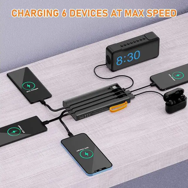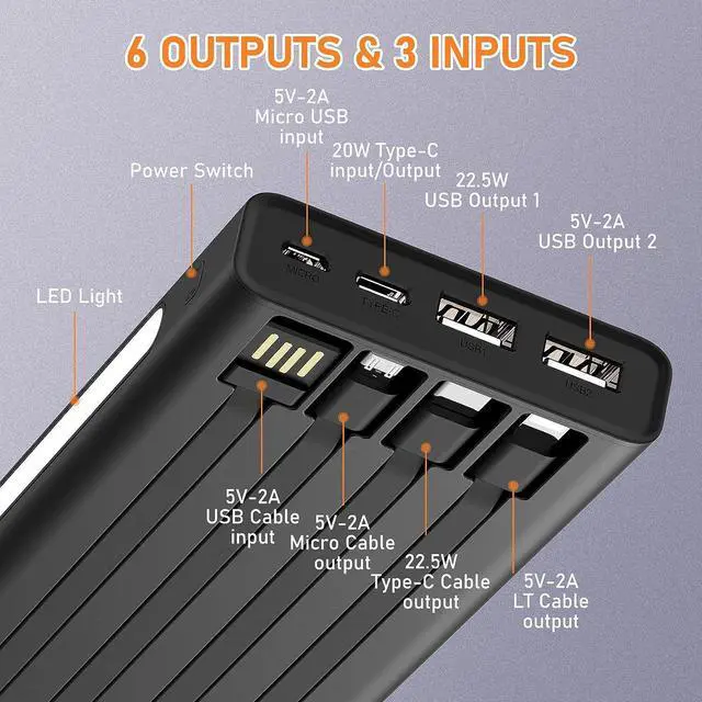 6 Outputs and 3 InputsUSB C Portable charger has 6 outputs and 3 inputs, you may charge 6 devices max Simultaneously. recharge power bank with 3 inputs options easily. Battery pack builts in 3 output cables and another 3 outputs (Total 6 outputs), great Compatible with iPhone, android or micro devices. It also builts in 3 inputs (1 built-in recharging cord, 1 usb c input, 1 micro input), which you can use any one of them to recharge external battery power bank conveniently.