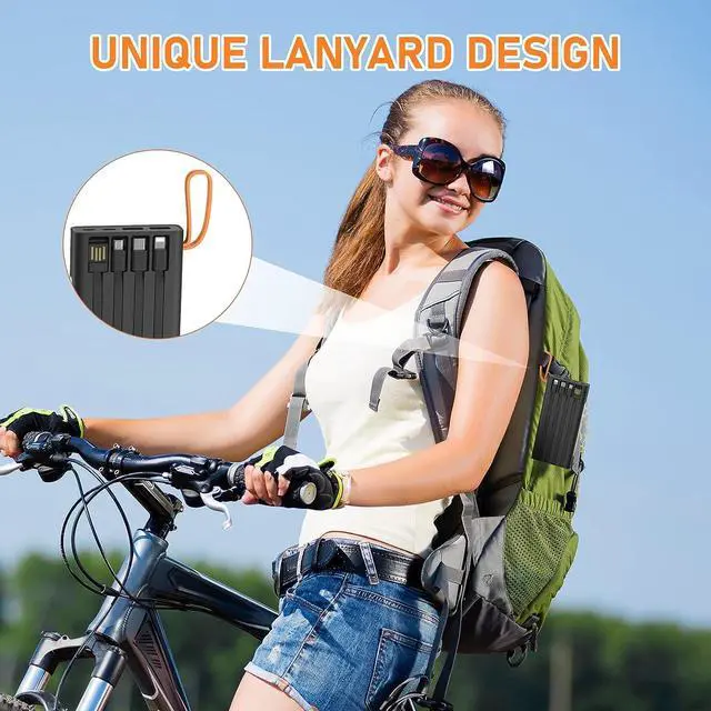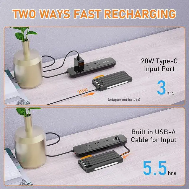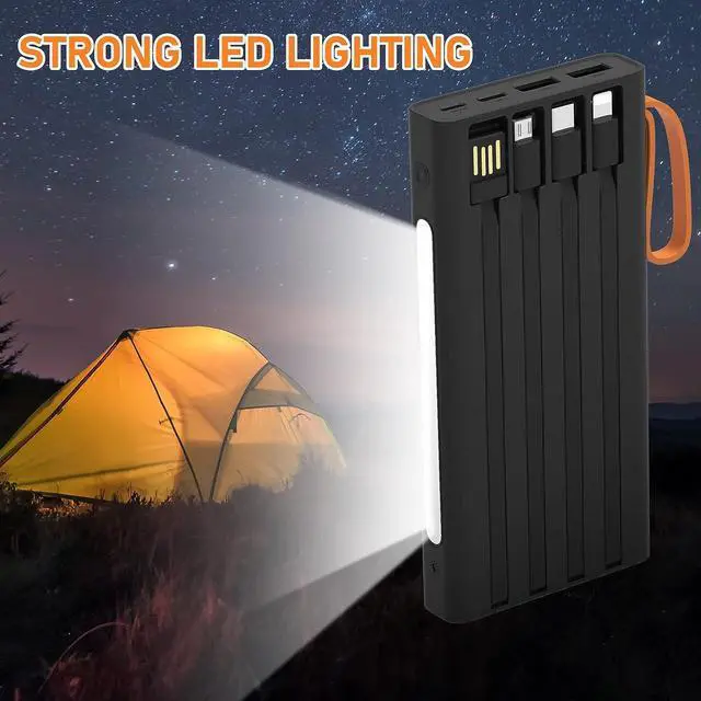 Portable charger Power bank with built in cablesUltra Slim Portable phone Charger with built-in 3 output cables for iPhone, USB-C devices and micro-USB devices. also built-in USB-A input cable for charging this portable charger itself. no need to carry any cords when going out.
