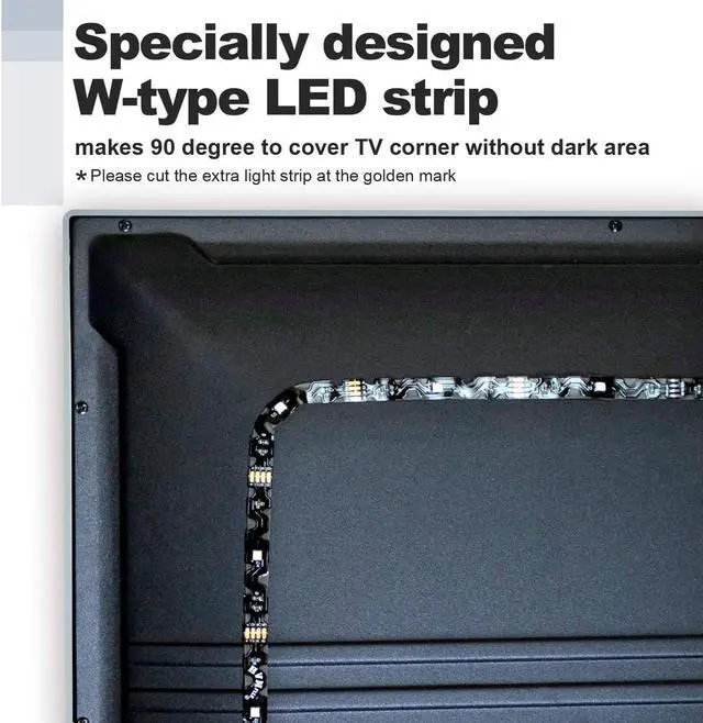 Custom Size to Fit Your TVCustomized 18FT Length of LED TV Backlight is suitable for covering 4/4 side of 70 75 80 82 85inch TV. The special W-shape LED TV Backlight can be curved smoothly by 90 degree and covered every side. A stronger adhesive can stick well behind the TV, but please make sure to clean the back surface of your TV before installation.