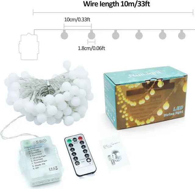 LED Warm Fairy Tales]: These LED fairy lights contain 100 fine white spherical shape LED bulbs. The total length of the string of lights is 33ft. The distance between the individual bulbs is 0.33 ft.