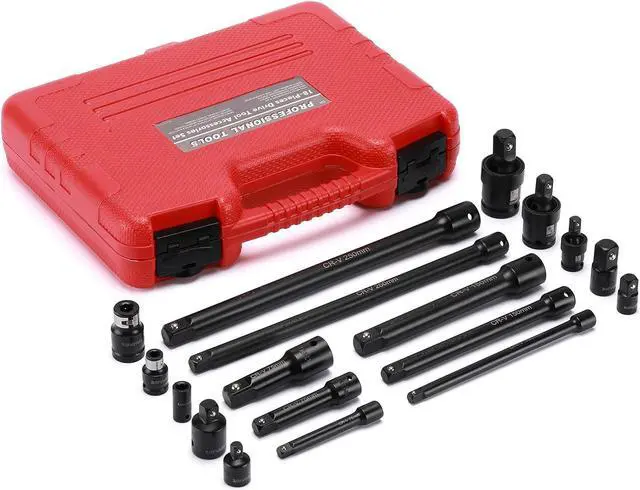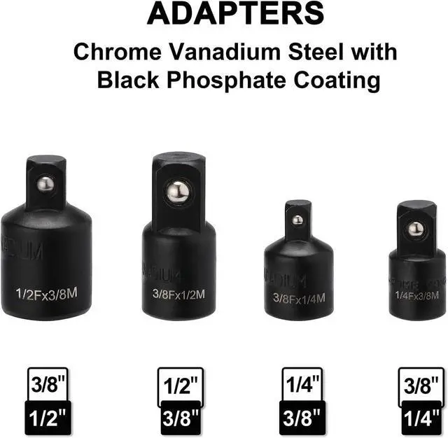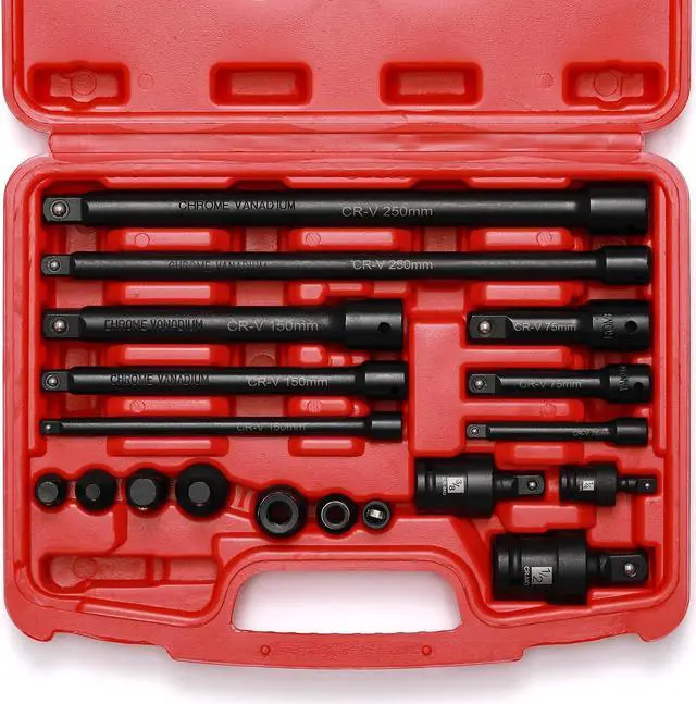 Includes: 8 pcs extension bars in 1/4", 3/8" & 1/2" Drive; 4pcs Impact socket adapters, 3pcs