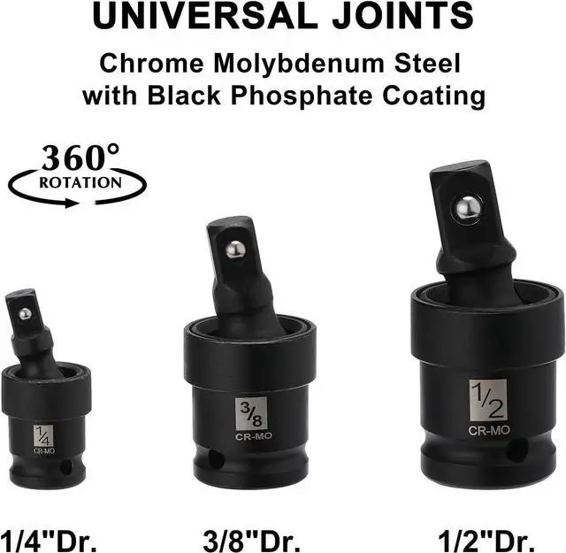 Impact universal joints: 1/4", 3/8"& 1/2"Drive; 3pcs