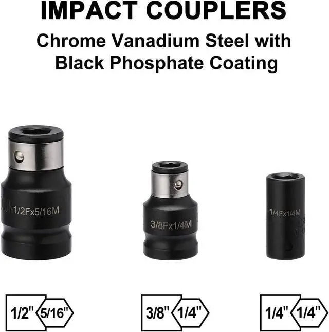Impact coupler: 1/4"F*1/4"M, 3/8"F*1/4"M, 1/2"F*5/16"M.