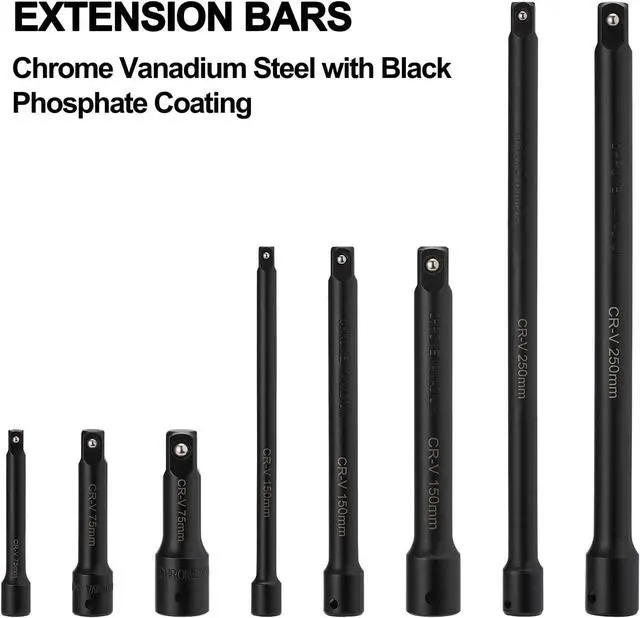 The impact extension socket set is made of heat treated chrome vanadium steel with corrosion-resistant black phosphate finish for durability.