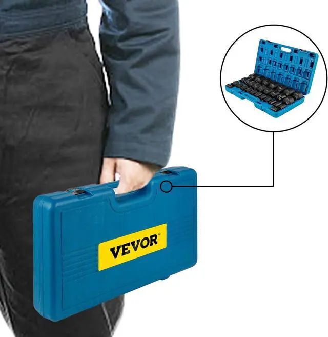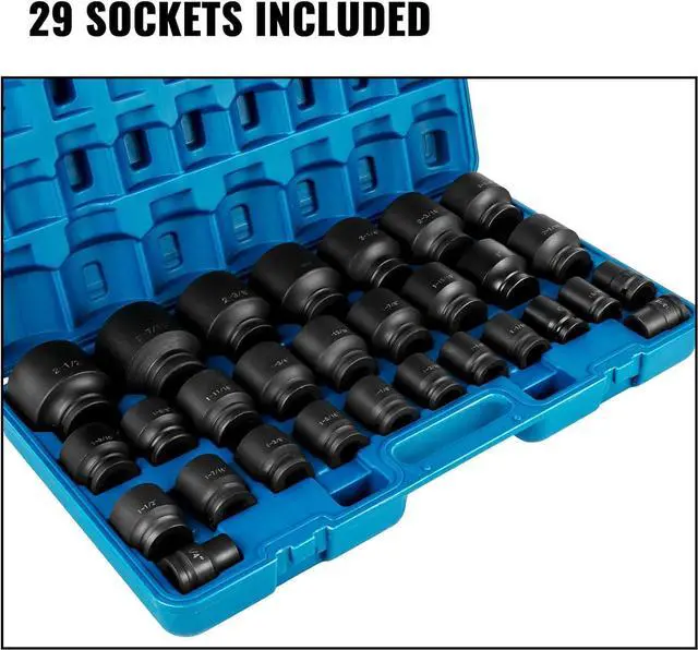 26 Sockets Included: This effort-saving 3/4 inches drive impact socket set comes with 29 shallow impact drive sockets: 3/4'', 13/16'', 7/8'', 15/16'', 1'', 1-1 / 16'', 1-1 / 8'', 1-3 / 16'', 1-1 / 4'', 1-5 / 16'', 1-3 / 8'', 1-7 / 16'', 1-1 / 2'', 1-9 / 16'', 1-5 / 8'', 1-11 / 16'', 1-3 / 4'', 1-13 / 16'', 1-7 / 8'', 1-15 / 16'', 2'', 2-1 / 16'', 2-1 / 8'', 2-3 / 16'', 2-1 / 4'', 2-5 / 16'', 2-3 / 8'', 2-7 / 16'', 2-1 / 2''.