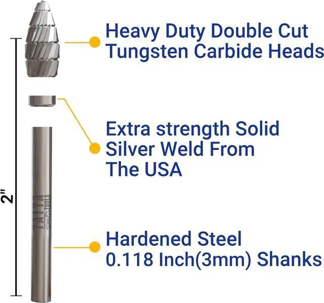 [TOP QUALITY MATERIAL] These rotary tool bits are made with premium carbide tungsten steel, a highly durable material which is guaranteed to withstand the test of time. With a double cut tooth angle which prevents chipping, this tungsten carbide bit set is superior to any high speed steel burrs.