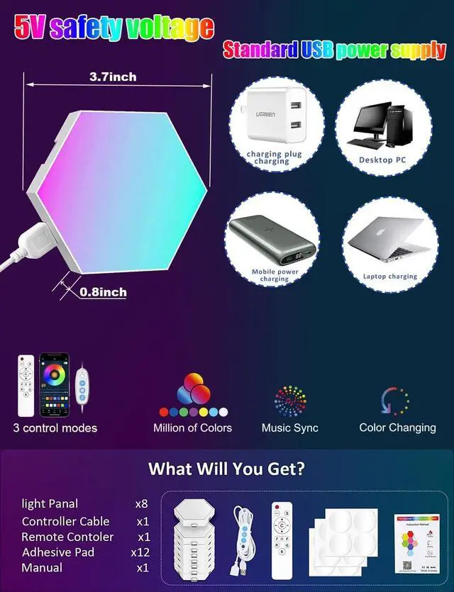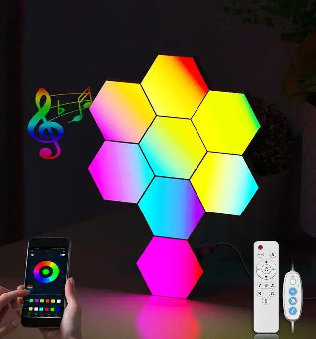 Smart APP and Remote ControlInstall the matching APP on your mobile phone, you can turn on/off the hexagonal led light, change the color, adjust the brightness to get the effect you want through the mobile APP, the operation is simple. Over 16 million colors can be switched at will to enhance the ambience.