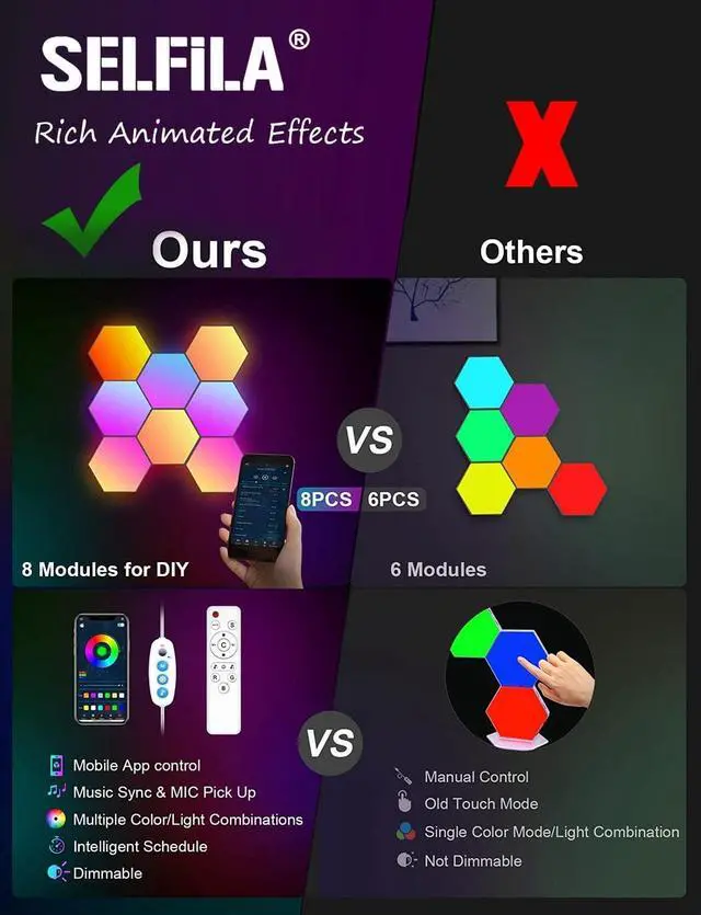 Cool and Gorgeous DecorationSELFILA hexagon lights Add a wow-factor to a room. You can create cozy and quiet ambiance for reading, multi-color light for party and holiday, yellow to make your home warm and pink to render romantic atmosphere, etc. An amazing and impressing light decor for various scenes: Gaming Setup, home, party, bedroom, wall, hall, commercial building, restaurant, bar, cafe, pub, concert, workshop, hotel, corridor, studio, stairwell, etc.