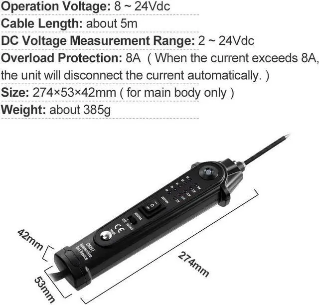 HAS LONG TEST LEADAuto power tester has long test lead. The cable length is about 5m (16ft) which allows you test any electrical system easily.