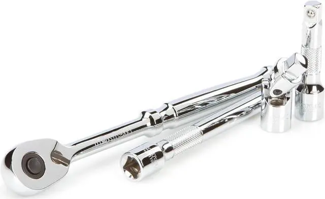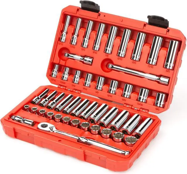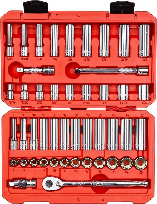 Includes 9-pc. 3/8 in. drive 12-point inch sockets: 5/16, 11/32, 3/8, 7/16, 1/2, 9/16, 5/8, 11/16, 3/4 in.; 9-pc. 3/8 in. drive deep 12-point inch sockets: 5/16, 11/32, 3/8, 7/16, 1/2, 9/16, 5/8, 11/16, 3/4 in.; 12-pc. 3/8 in. drive 12-point metric sockets: 8, 9, 10, 11, 12, 13, 14, 15, 16, 17, 18, 19 mm; 12-pc. 3/8 in. drive deep 12-point metric sockets: 8, 9, 10, 11, 12, 13, 14, 15, 16, 17, 18, 19 mm; 1-pc. universal joint: 3/8 in. drive; 2-pc. 3/8 in. drive extensions: 3, 6 in.; 1-pc. 3/8 in. drive quick-release ratchet: 8 in.; 1-pc. storage case