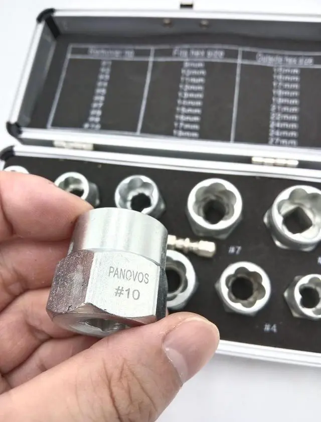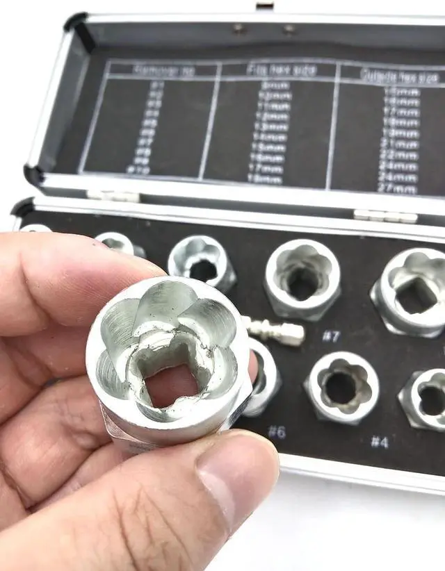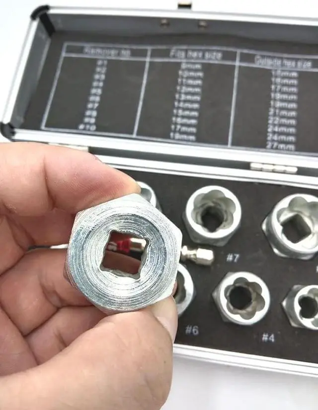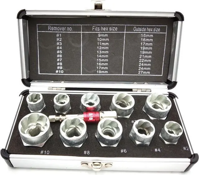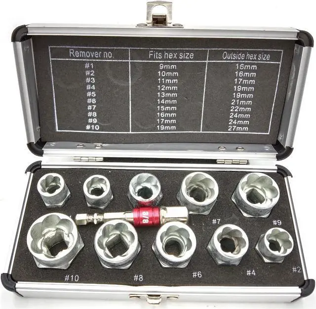 Application: Bolt & nut remover comes with 3/4" (19mm), 17mm, 5/8" (16mm), 15mm, 9/16" (14mm), 13mm, 12mm, 7/16" (11mm), 10mm, 3/8" (9mm) and a beautiful box, easy to carry, you can take it to any workplace.