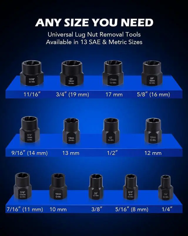 METRIC & SAE SIZES: This extractor tool set includes both metric and SAE sockets in the most commonly needed sizes, all clearly marked on each socket: 1/4", 8 mm (5/16"), 3/8", 10 mm, 11 mm (7/16"), 12 mm, 1/2", 13 mm, 14 mm (9/16"), 16 mm (5/8"), 17 mm, 11/16", 19 mm (3/4")