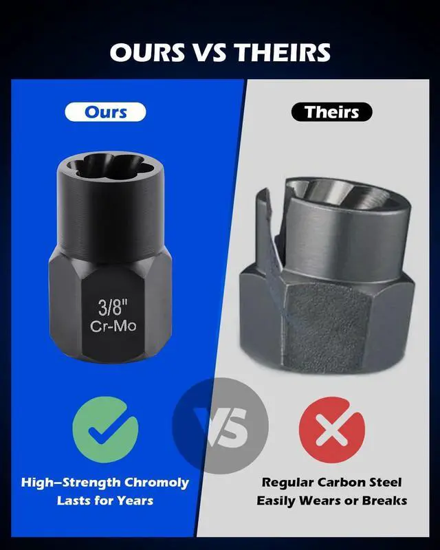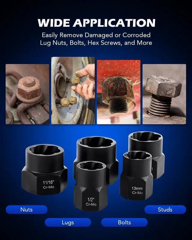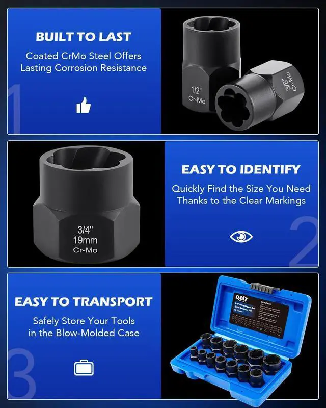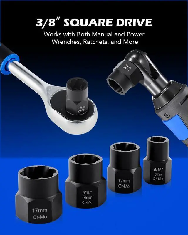3/8" DRIVE: Our nut and bolt extraction tools easily pry off rusted, stripped, and frozen fasteners, working with manual and power tools with 3/8-inch drives including impact wrenches, air ratchets, and breaker bars