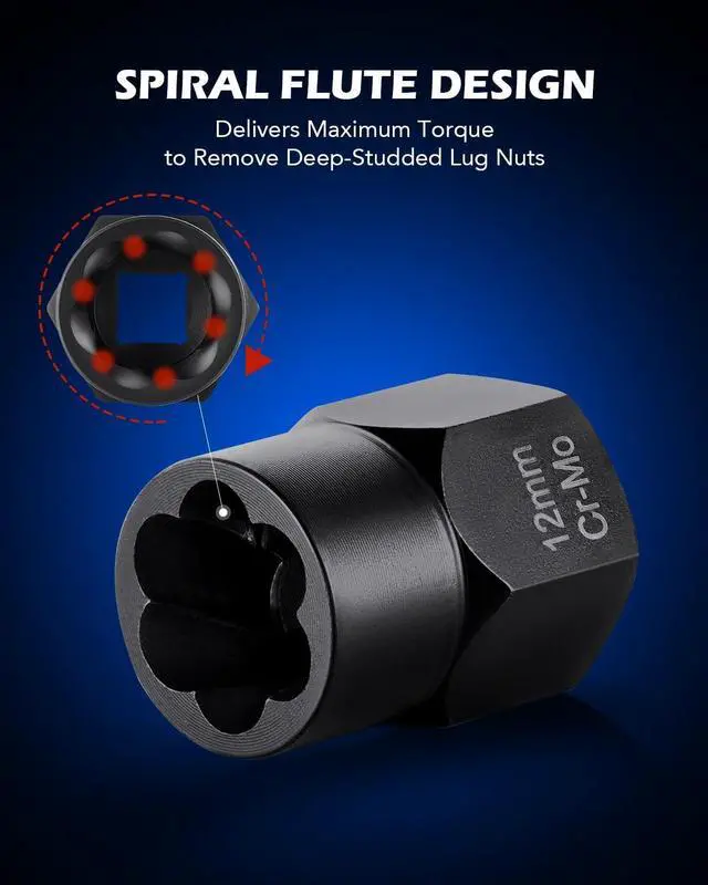 6-POINT SPIRAL GRIP: Each part of this socket set for stubborn nut removal has six points of contact and an interior spiraling design to offer maximum grip and torque as you pry off damaged, corroded, and coated nuts, bolts, lugs, studs, hex screws, and more