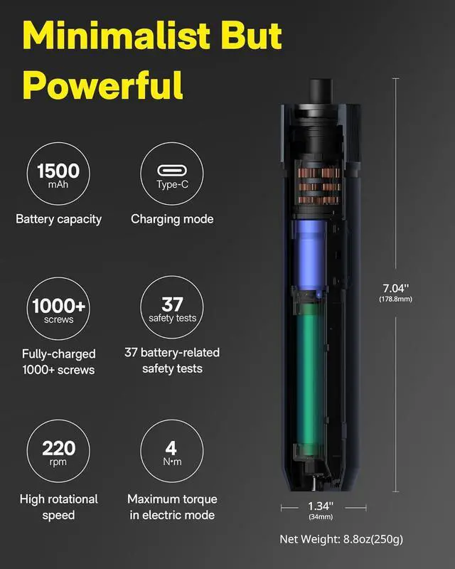 MINIMALIST BUT HIGHLY FUNCTIONAL: The 1500mAH large capacity battery, which is experienced 37 battery-related safety tests, provides ultra-long endurance that the screwdriver can run more than 1000 screws when it is fully-charged. The high-speed magnetic motor and metallic gearbox provide strong and stable power output to the cordless screwdriver. And the universal type-c charging interface makes the charging of the screwdriver convenient.