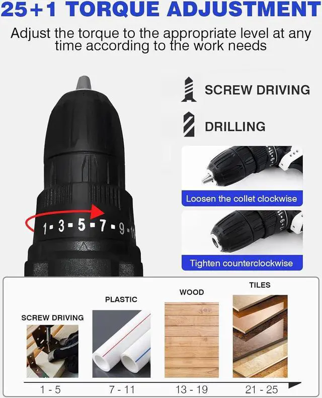 25+1 Position Clutch & 2-Speed Settings The power drill can Choose from 1 of 25+1 torque options on the clutch, provides precise control for driving in/out screws to prevent stripping. 2-speed design (0-400/0-1400Rpm) covers a wide range of drilling holes and working uses.