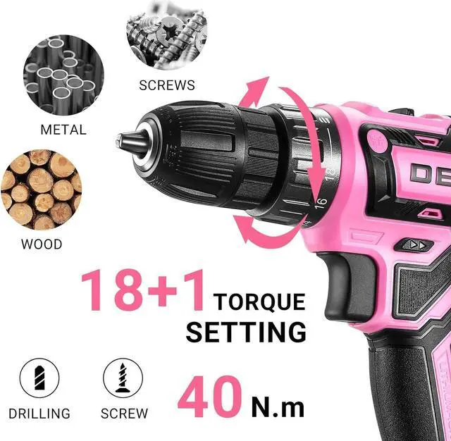 20V Electric DrillThis electric drill cordless has two Variable Speed (0-350/0-1350 rpm) and 18+1 torque settings.