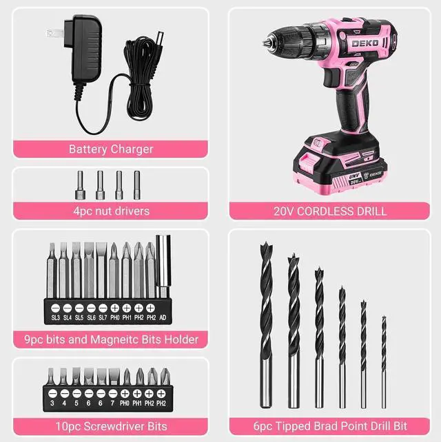 Pink Drill with Drill BitsThis drill set include 1*20V Cordless Drill; 1* 1.5AH Battery; 1*Charger; 10*Bits(SL3-SL4-SL5-SL6-SL7-PHO-PH1-PH2-PH2); 1*Magneitc Bits Holder (60mm); 10*Screwdriver Bits; 6*Tipped Brad Point Drill Bits; 4*Nut Drivers; 1*User Manual