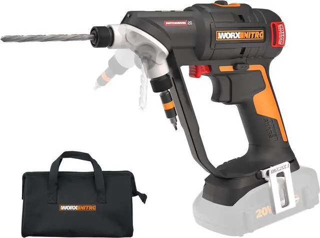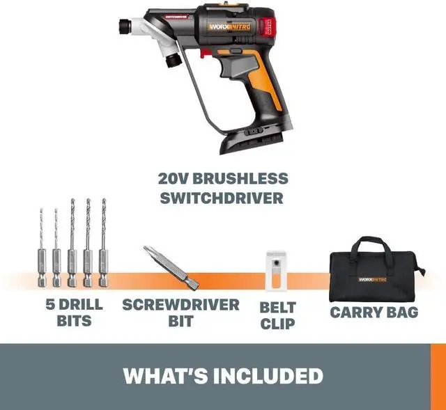 INCLUDES: (1) 20V Nitro Switchdriver 2.0, (1) 2" Screwdriver Bit, (3) 1/8" Hex Shank HSS Drill Bits, (2) 3/32" Hex Shank HSS Drill Bits, (1) Belt Hook, (1) Carry Bag