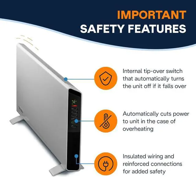 Built-In Safety Features - Include a thermal shutoff to prevent overheating and an internal tip-over switch that automatically turns the unit off if it falls over.