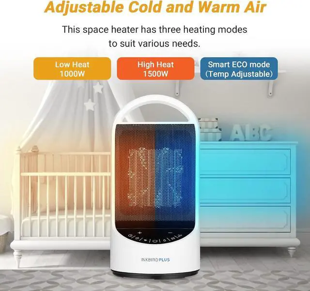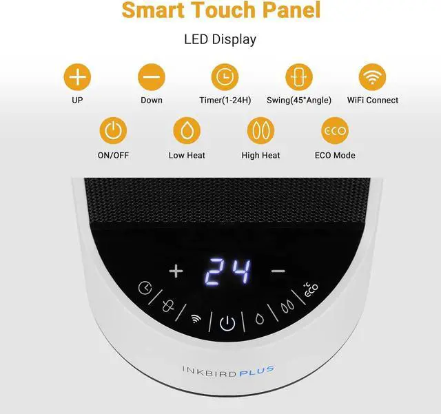 WiFi REMOTE & PANEL CONTROLYou can remotely control the indoor heater on the INKBIRD APP anytime, and LED panel manual control for turning the electric heater On/Off, changing the temperature, switching between 3 modes (High, Low, and ECO), setting the 24h timer, and turning oscillation ON/OFF.