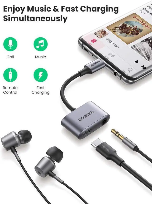 Listening While Charging: UGREEN 2 in 1 USB C to 3.5 mm Audio adapter enables you to listen and charge simultaneously on your Type C adapter. With this USB C to Aux adapter, you can connect devices with a 3.5 mm audio plug like earphone, headset, headphone or speaker while charging.