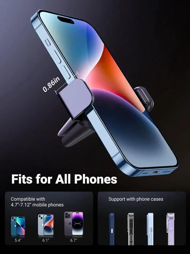 Broad Compatibility: This vent phone mount for car is compatible with 4.7 to 7.12 inch mobile phones, with width range from 2.4" to 3.6". It's compatible with new iPhone 15 Pro, iPhone 14 Pro 14 Plus 14 13 12 Mini, iPhone 11 Pro XS Max XS XR 8 7 Plus 6S SE, Samsung Galaxy S22 S21 S10 S9 S8 S7, etc.