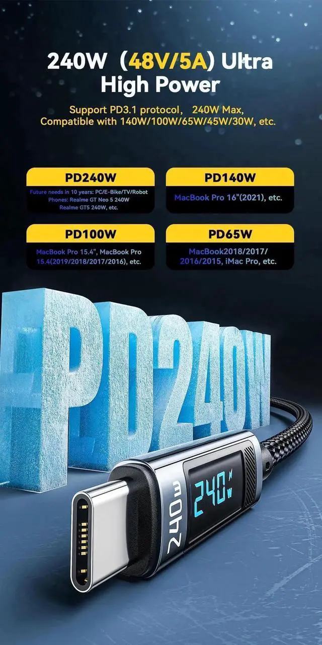 240W USBC to USBC Cable with LED Display 1 Pack 3.3ft, Type C to Type C Cable, USB C Charger Cable Fast Charging Compatible with MacBook Air/Pro, iPad Pro 12.9/11/Air/Mini, Samsung S23/22/21