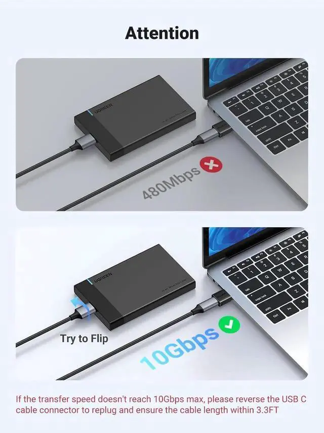Note: If the transfer speed doesn't reach 10Gbps max, please reverse the USB C cable connector to replug and ensure the cable length within 3.3FT