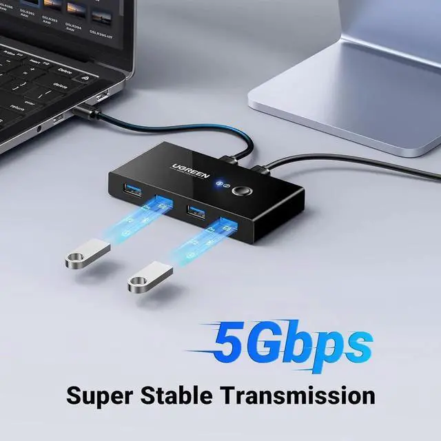 Transfer Files in Seconds: With the 4x USB 3.0 ports, UGREEN USB Switcher supports up to 5Gbps data transfer speed. You can easily transfer data from U disk, mobile hard disk to computer. It's backward compatible with USB 2.0, too. (*It is recommended to power supply when using multiple devices simultaneously to avoid disconnection due to insufficient power.*)