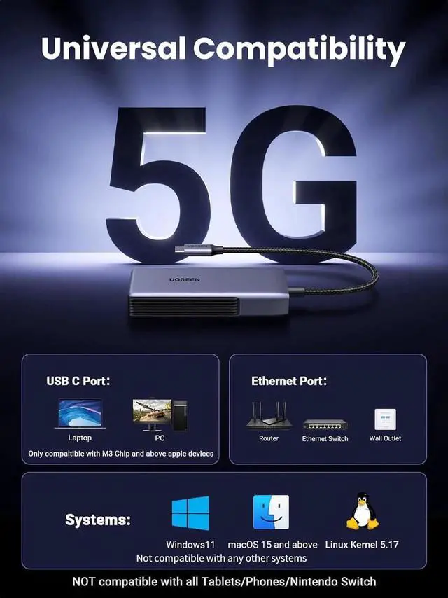 Great Compatibility: UGREEN usbc to ethernet adapter supports Windows 11, macOS 15 and above, Linux Kernel 5.17 (not compatible with any other systems). For Windows 11 and Linux Kernel 5.17, drivers need to be installed, which you can easily install with our instructions. For macOS 15 and above, it is plug and play