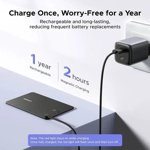 Rechargeable & Long-Lasting: Magnetic charging in 2 hour powers up to 1 years. No need to replace batteries like single-use wallet trackers, easily check the battery level through the app. (TIP: The red light will stay on and turn off after fully charged. The tracker is fully charged when it comes, so it may flash a red light and go off when charging at this time)