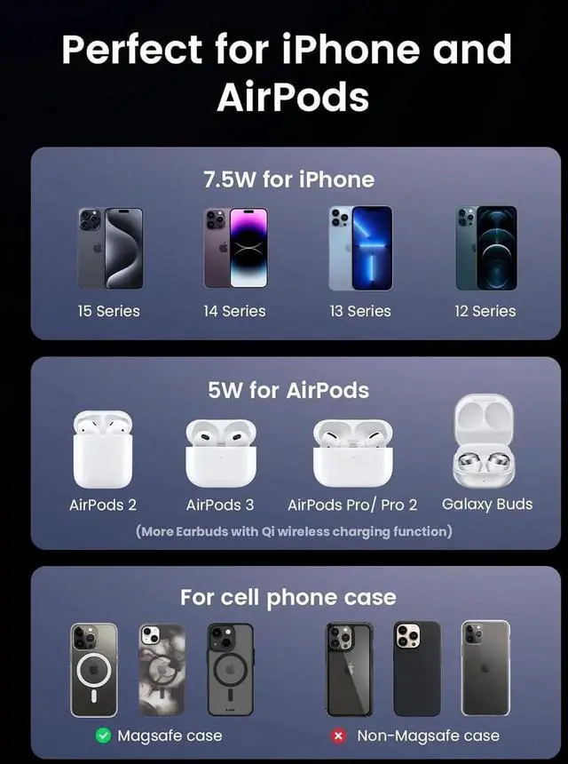 Multi-device Fast Charging: Ugreen magnetic wireless charger simultaneously powers up your iPhone and AirPods, with an additional 5W USB-C output for extra convenience