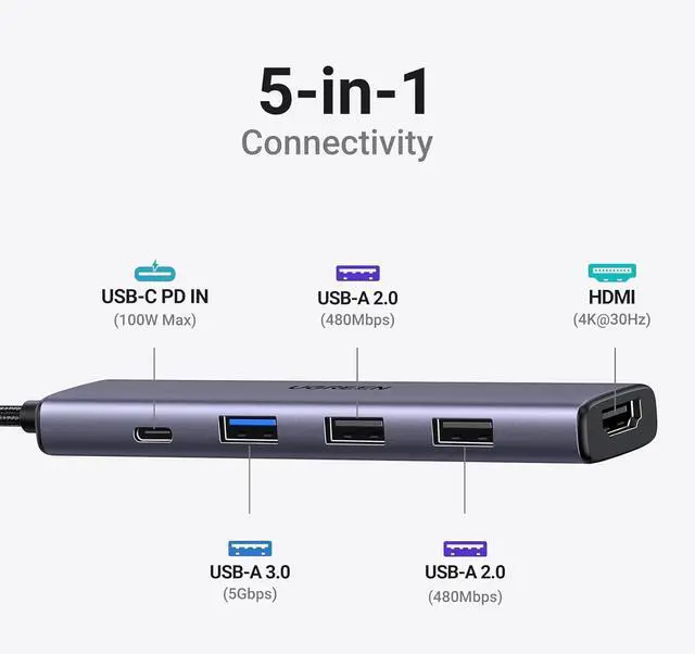 UGREEN Revodok 105 USB C Hub 5 in 1 Multiport Adapter 4K HDMI, 100W Power Delivery, 3 USB-A Data Ports, USB C Dongle for MacBook Pro/Air, iPad Pro, iMac, iPhone 16 Pro/Pro Max, XPS, Thinkpad