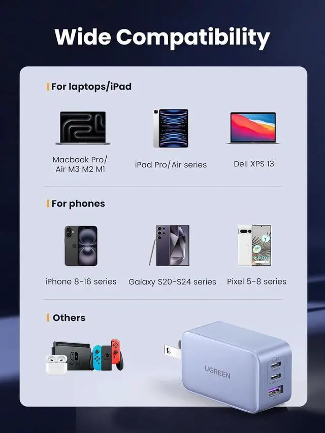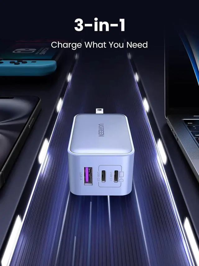 Travel Friendly, Compact Design: Thanks to a cutting edge GaN chip, Ugreen's 65W USB C charger is 50% smaller than the original 61W USB C charger; A foldable plug provides more portability and a better travel experience