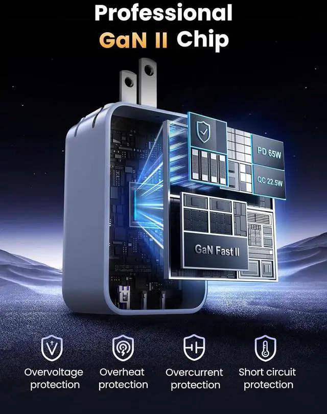 Adopted GaN Safety & Efficiency: Utilizing GaN technology, this 65W power adapter provides safe, cooler charging to protect your devices while optimizing energy usage