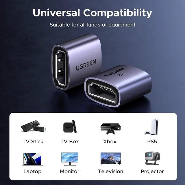 Universal Compatibility: UGREEN HDMI coupler female to female works with a wide range of devices, including TV boxes, Xbox 360 and One, Switch 2, Switch, PS4/3/2, Blu-Ray players, PC, laptops, HDTVs, monitors, and projectors. It's also backward compatible with HDMI 2.0/1.4/1.3/1.2/1.1 versions
