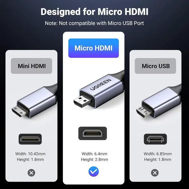 8K@60Hz Micro HDMI to HDMI Cable: UGREEN Micro HDMI cable supports 8K@60Hz, 4K@240Hz, and 4K@144Hz Full HD resolution. It can help you to stream audio and video from a camera, tablet or laptop through the Micro HDMI Port to Your HDTV or projector with an HDMI port. NOTE: Please pay attention to the interface of your device, micro HDMI port NOT mini HDMI or micro USB
