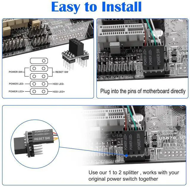 Easy to install: Please check the installation instructions on product description. Just connect the POWER LED+, POWER LED-, POWER SW, RESET SW, HDD LED+ connectors with motherboard and stick the adhesive plate in the right place.