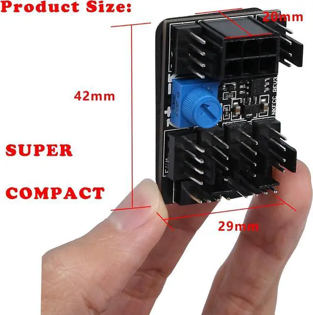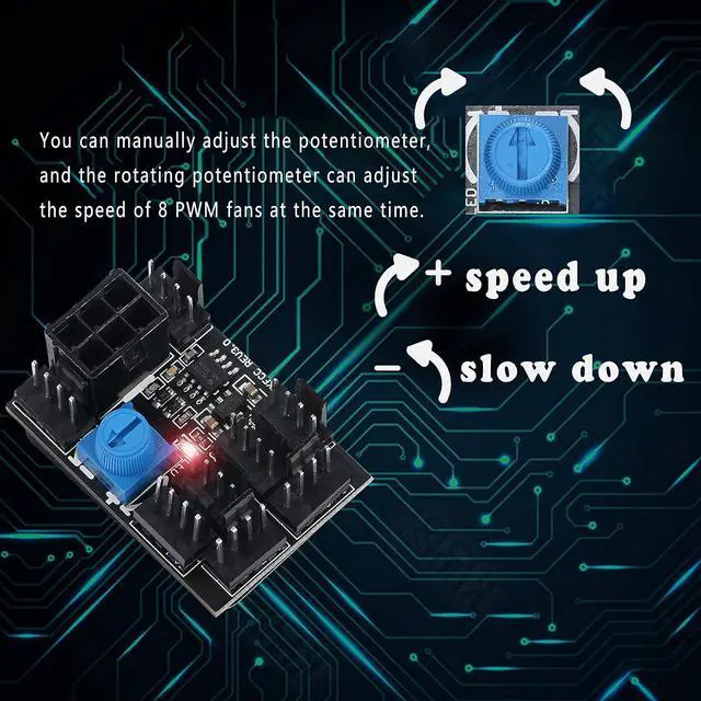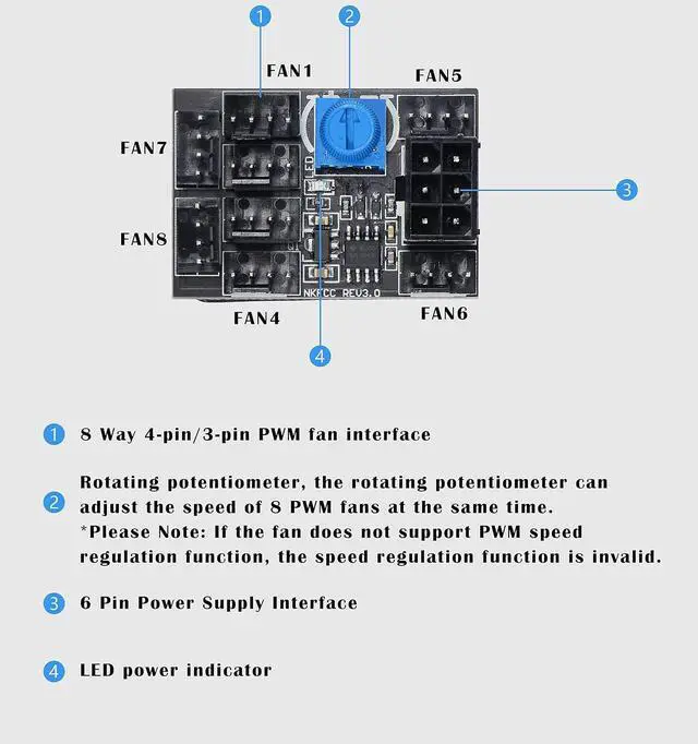 [Function] - Through this hub, the governor can supply power to up to 8 fans, and the rotating potentiometer can adjust the speed of 8 PWM fans at the same time.