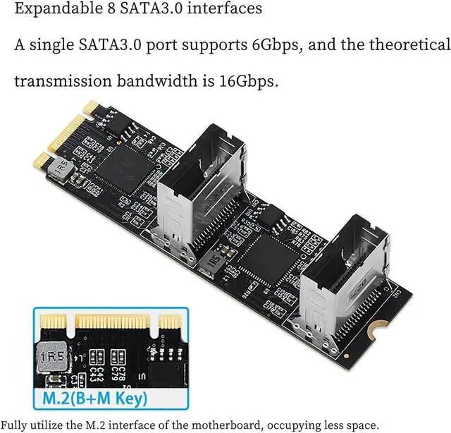 AttentionThe standard M.2 board is 0.8mm thick, please connect all cables first and then insert them into the M.2 slot; Under Win system, Only 5 ports can be recognized, and all ports can be recognized after entering the system and installing the driver.