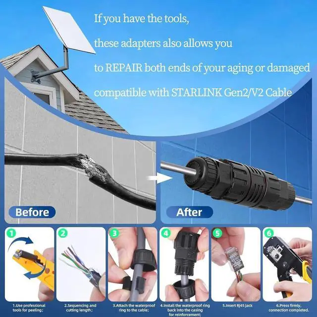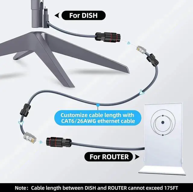 Extend or Repair the Run (Gen 2/V2) Use your own CAT6 26AWG solid copper cable to customize the length between the satellite dish and the router up to 175 ft. With basic tools, these adapters also let you repair both ends of an aging or damaged Gen 2 cable.