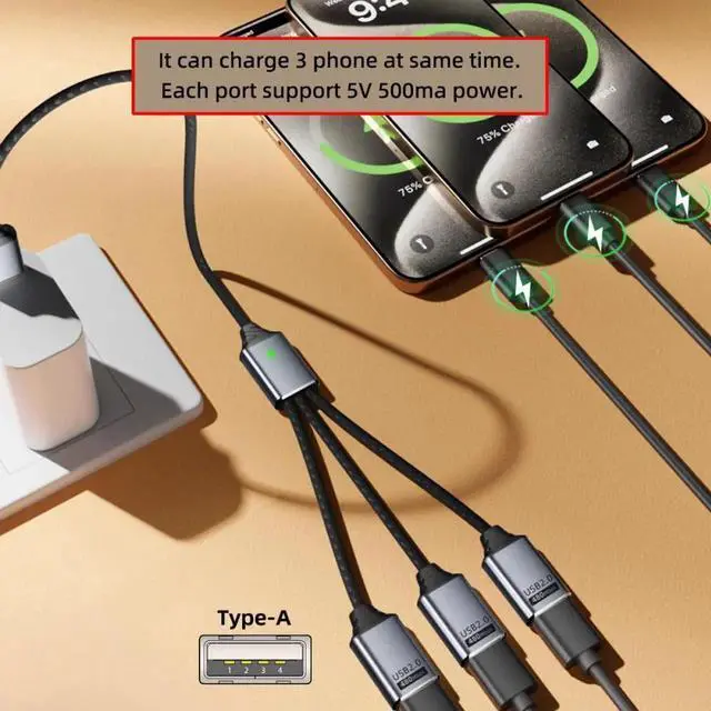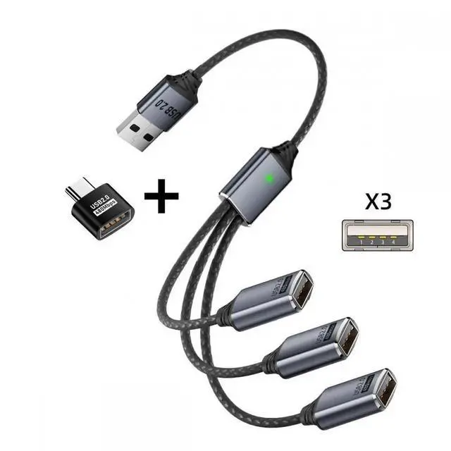 USB 2.0 to 3 Ports Hub Cable Bus Power Type-A 1 to 3 Data for Laptop Desktop Phone Mouse Keyboard Printer Disk