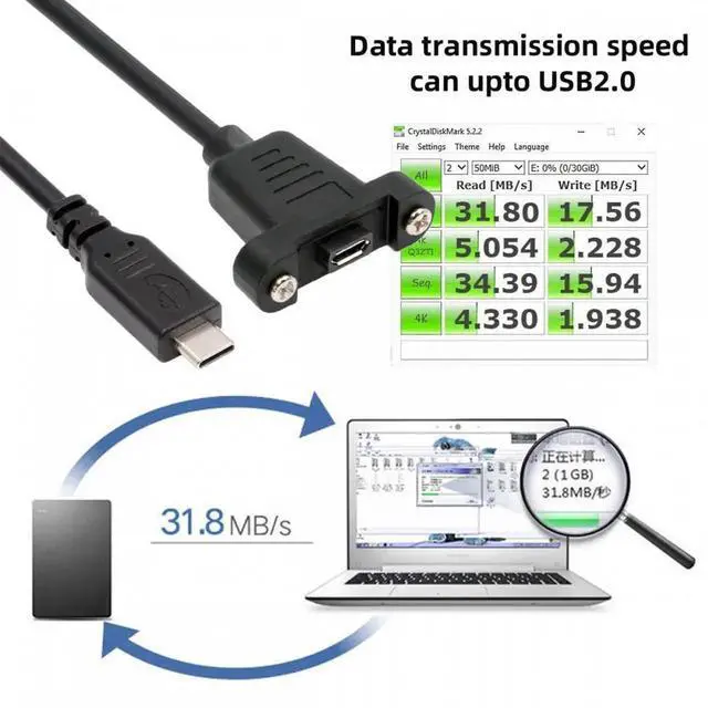 • USB2.0 Micro 5Pin Female to Type-C USB-C Male Power Cable 480Mbps Data with Panel Mount Holes 50cm