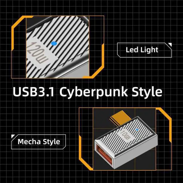 USB-C USB 3.1 Type C Male to USB 3.0 A Female 10Gbps OTG Data 120W Power Left Right Angled Adapter Alloy Shell Mecha Cyberpunk Style