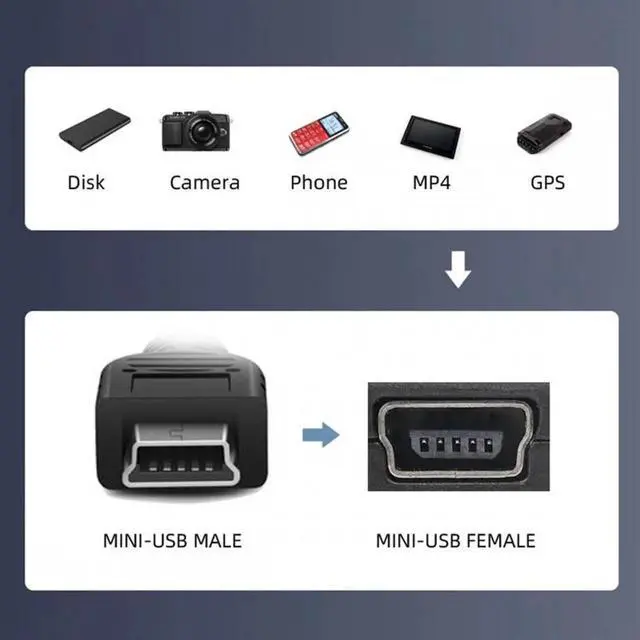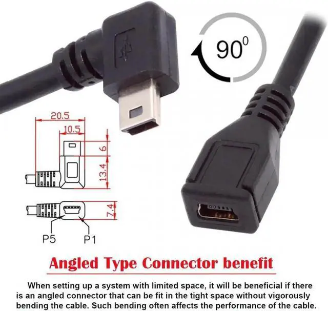 Used to connect USB Mini cables in tight fit applications. Can work for all mini USB 5pin device extension.